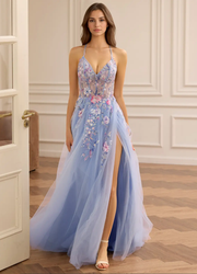 Halter V-neck A-Line Princess Ball gown Sequin Tulle Embroidery with Beading Prom Dress Corset - Blue / US2