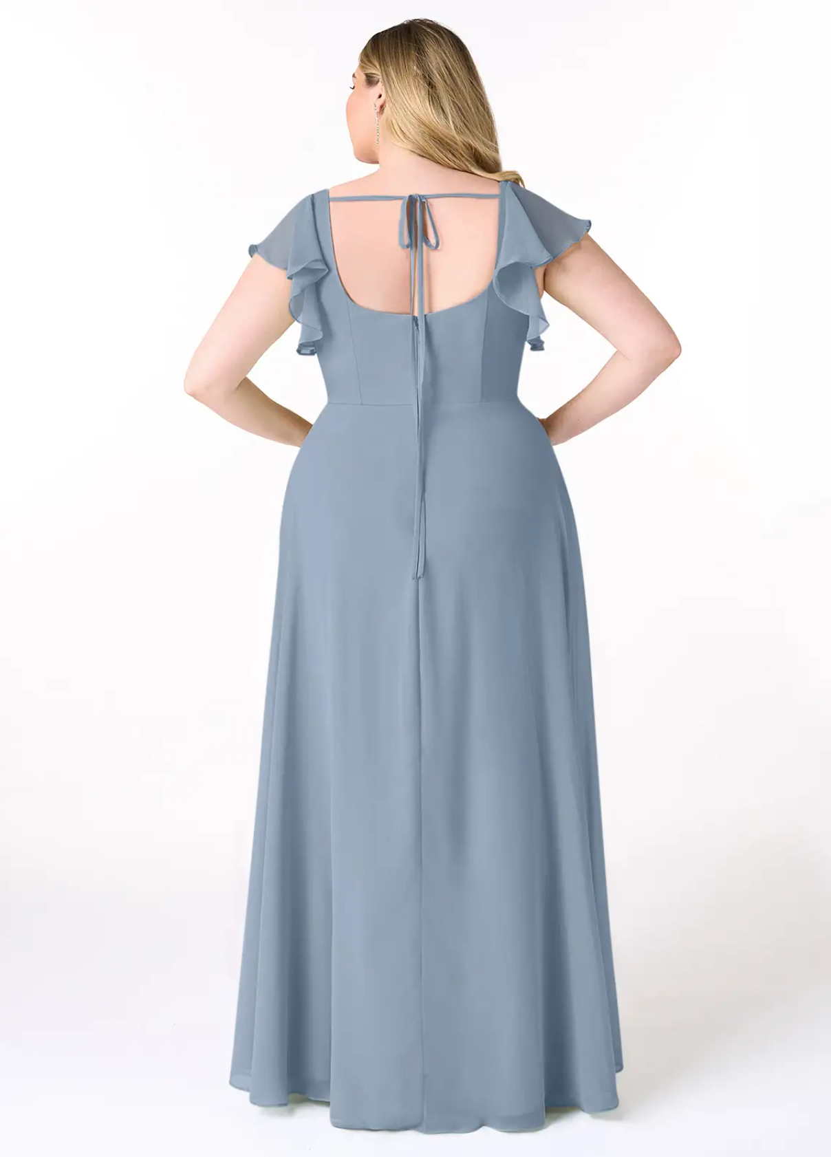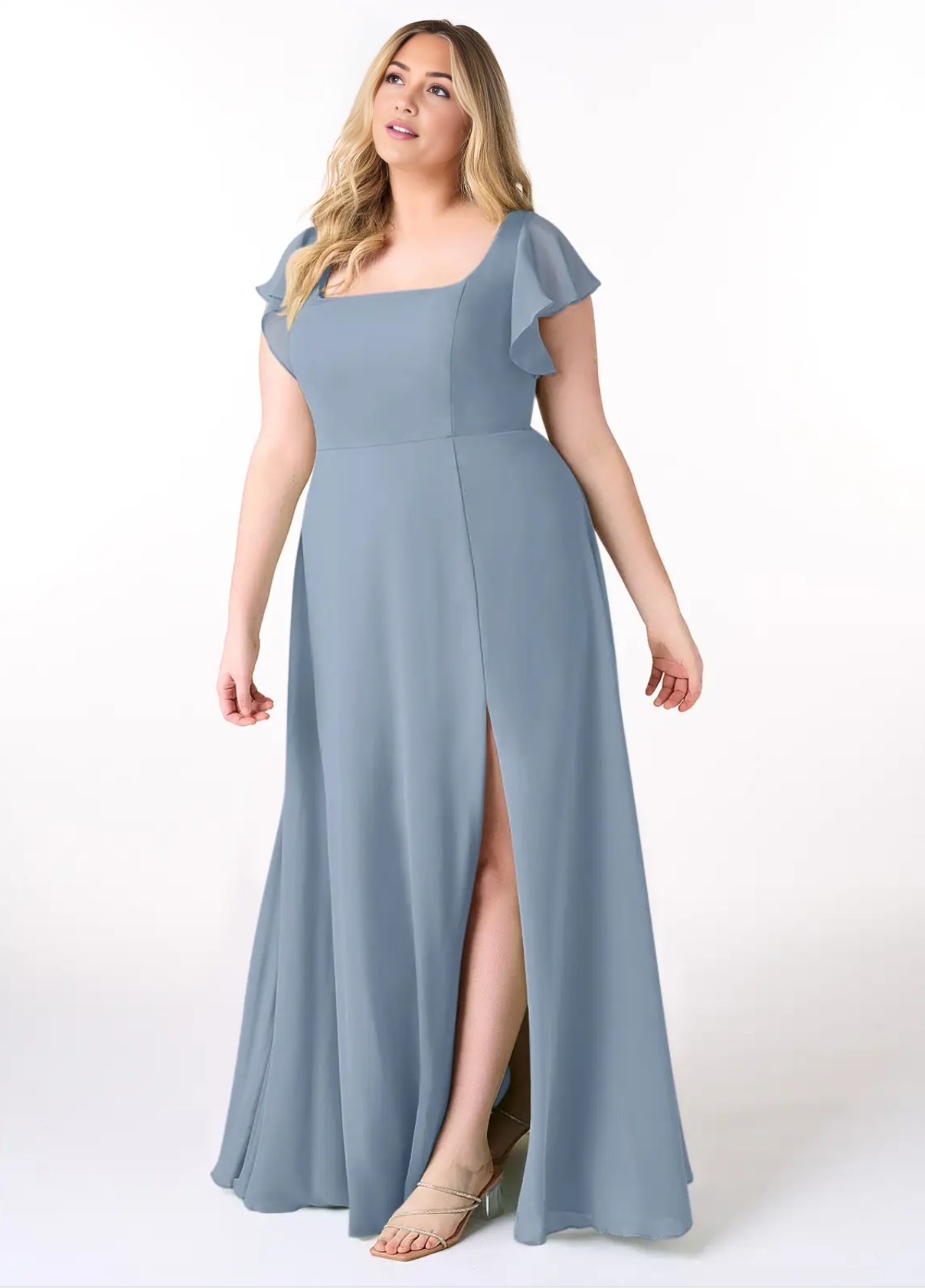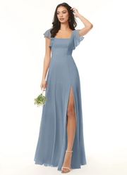 Elegant Square Neck Flutter Sleeve Maxi Dress with High Side Slit A-Line Formal Gown Bridesmaid Dresses