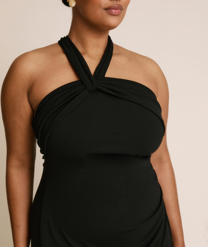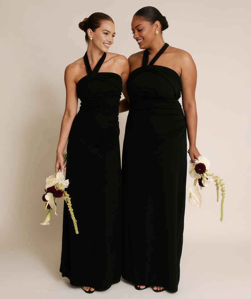 Cross-Front Halter Neck Stretch Floor-Length Bridesmaid Dress For Wedding Party Evening Gown - Black / US2