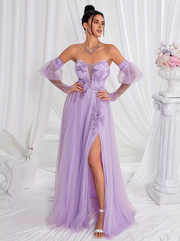 Elegant Off-the-Shoulder Embroidered Chiffon Maxi Dresses Prom Dresses Elegant Mesh Patchwork Appliqué Bralette Women's Evening Gown - Light Purple / US 2