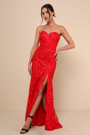 Trumpet/Mermaid Floral Embroidered Strapless Maxi Dress Formal Floor length Prom Dresses Evening Gown with High Slit - Red / US 2