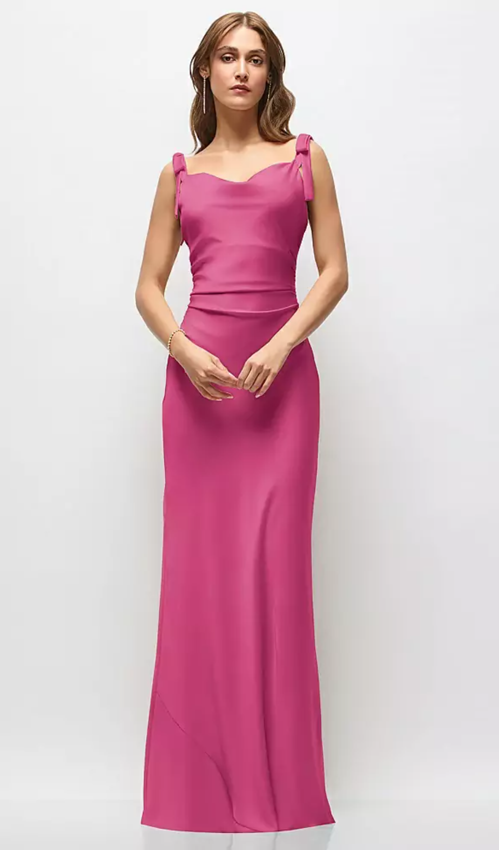 Women's Satin Cowl Neck Maxi Dress with Bow Shoulder Straps & Ruched Waist Formal Evening Gown Bridesmaid Dresses