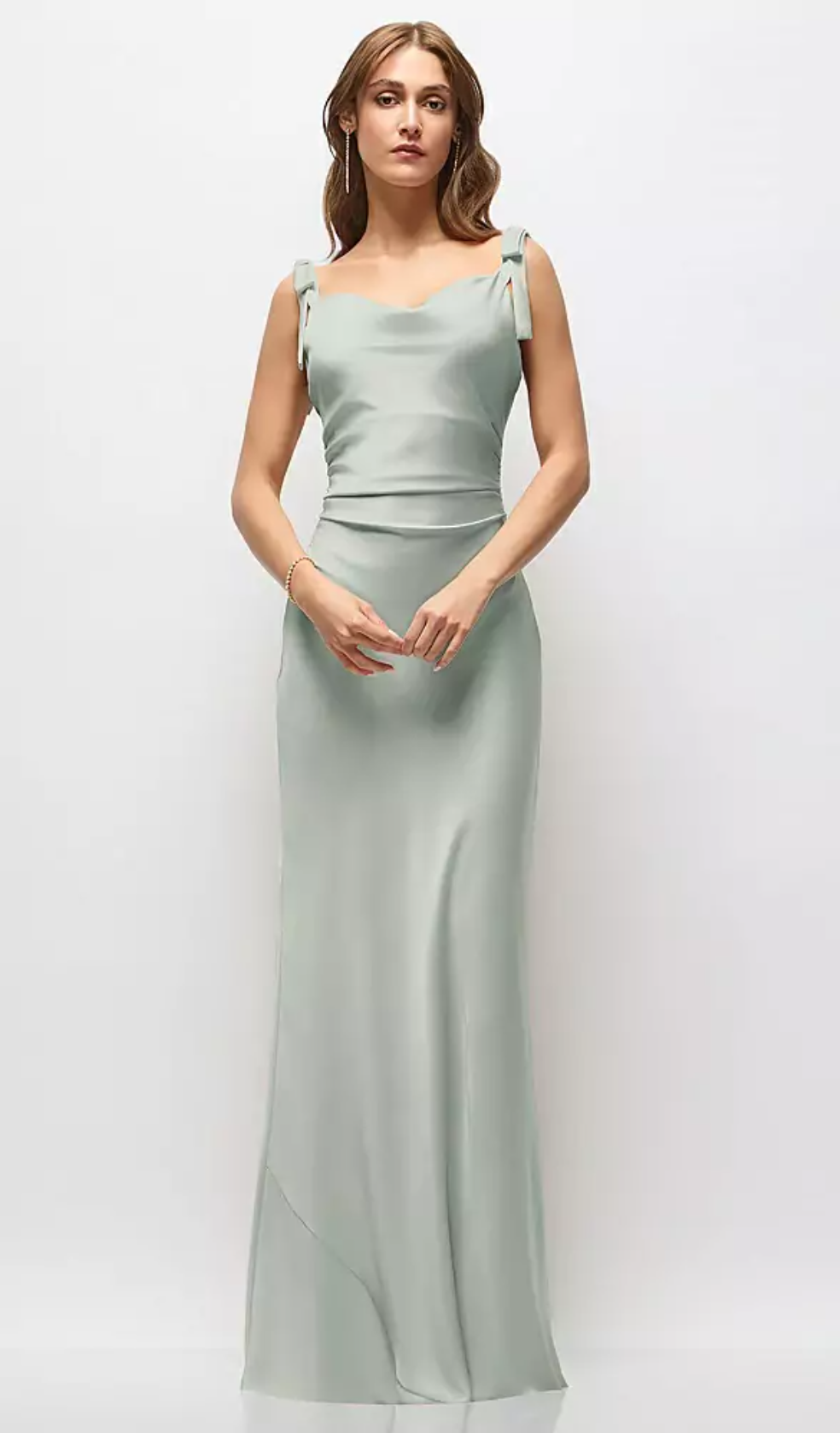 Women's Satin Cowl Neck Maxi Dress with Bow Shoulder Straps & Ruched Waist Formal Evening Gown Bridesmaid Dresses - Willow Green / US 2