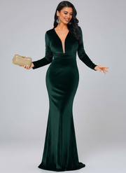 Women's Long Sleeve V-Neck Velvet Green Evening Dress Mermaid Party Wedding Guest Dresses