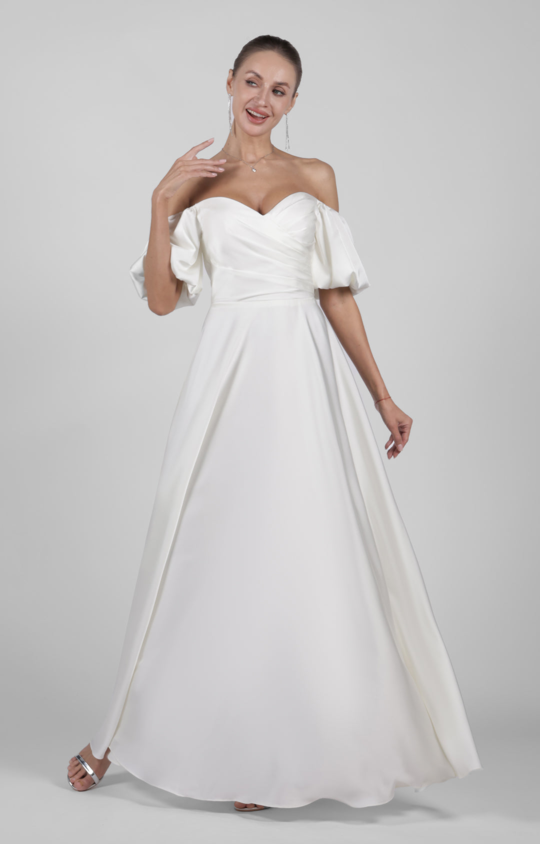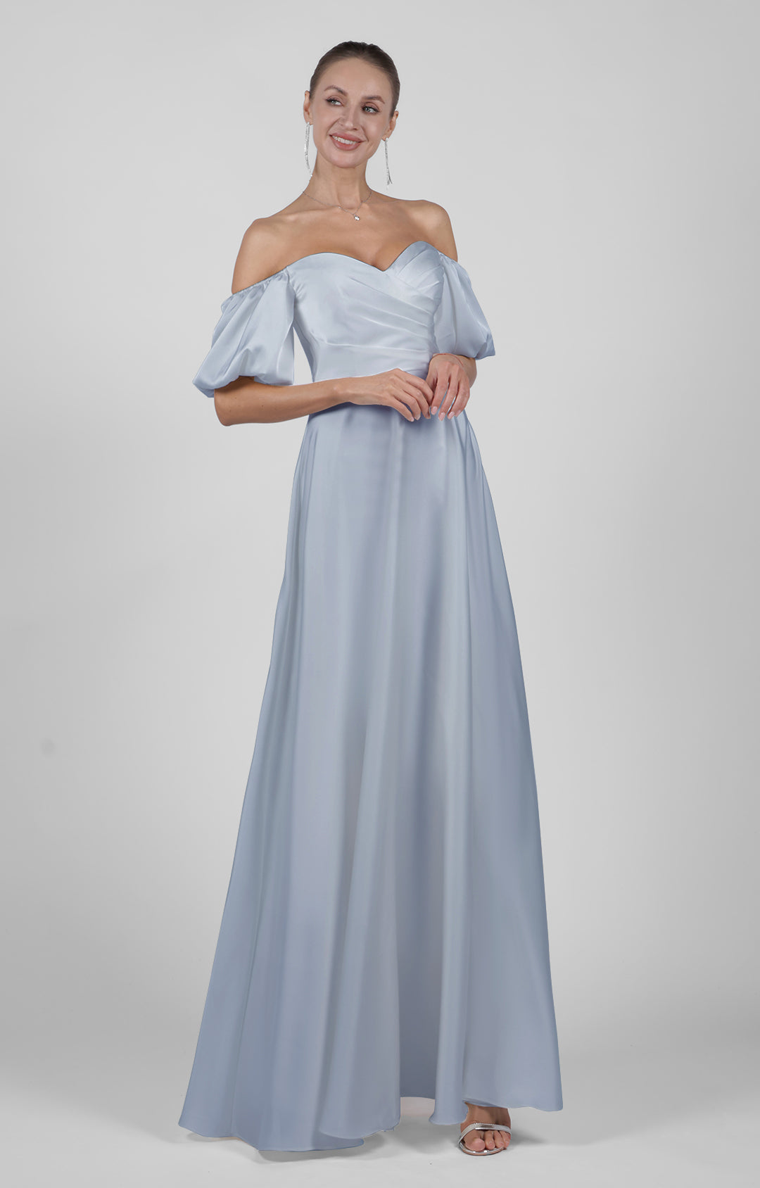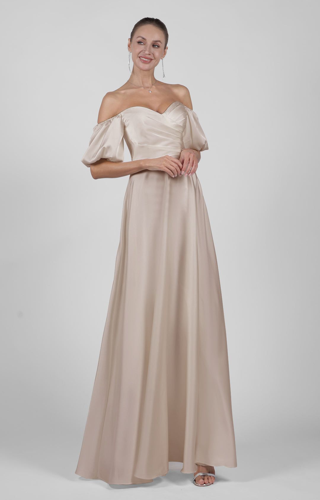 Elegant Off Shoulder Satin Wedding Dress with Puff Sleeves Floor-Length Bridesmaid Maxi Dress