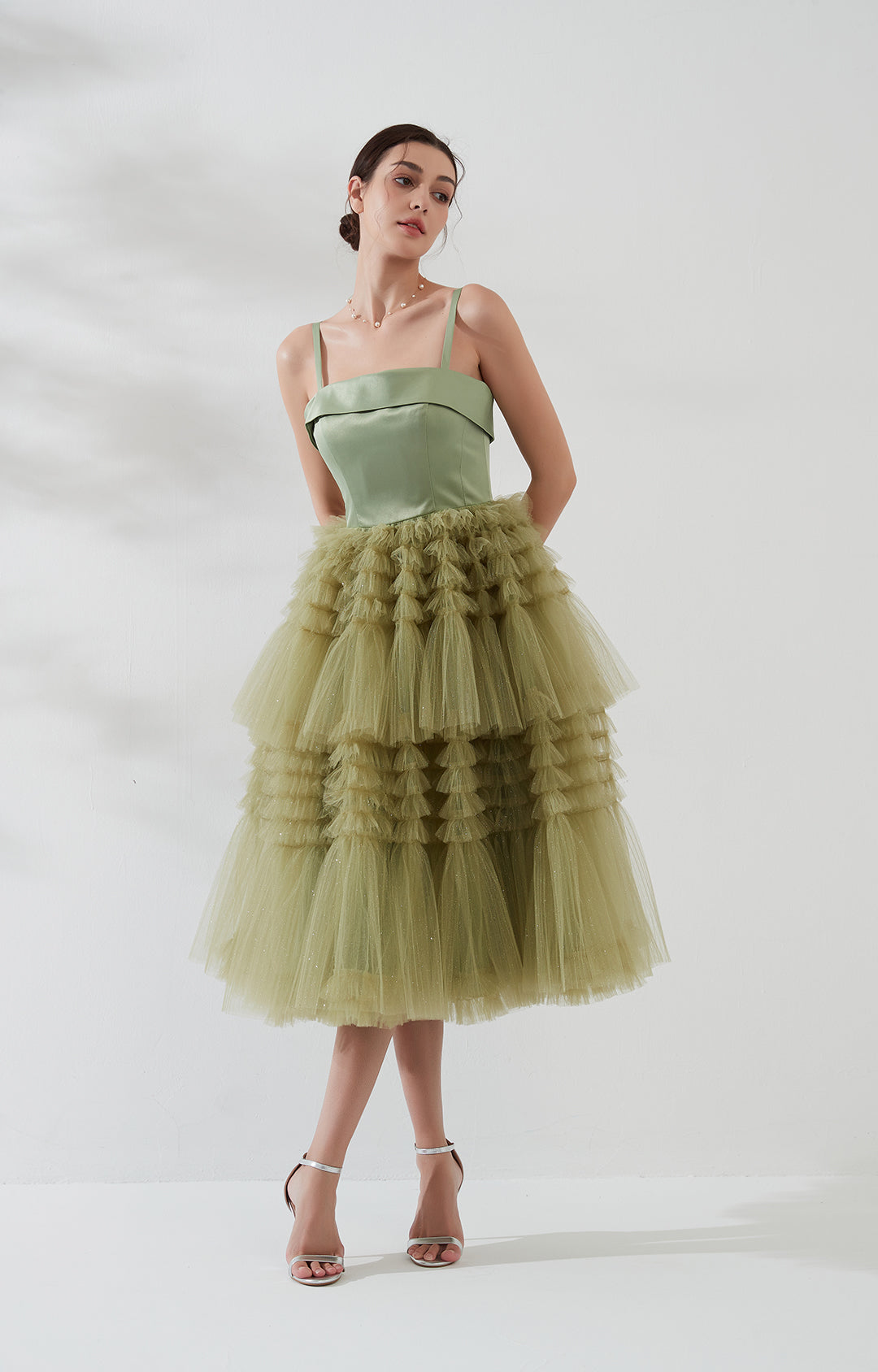 Elegant Spaghetti Strap Ruffle Satin Mesh Cocktail Party Dresses Wedding Events Mid-Calf Cake Dresses - Green / US 2