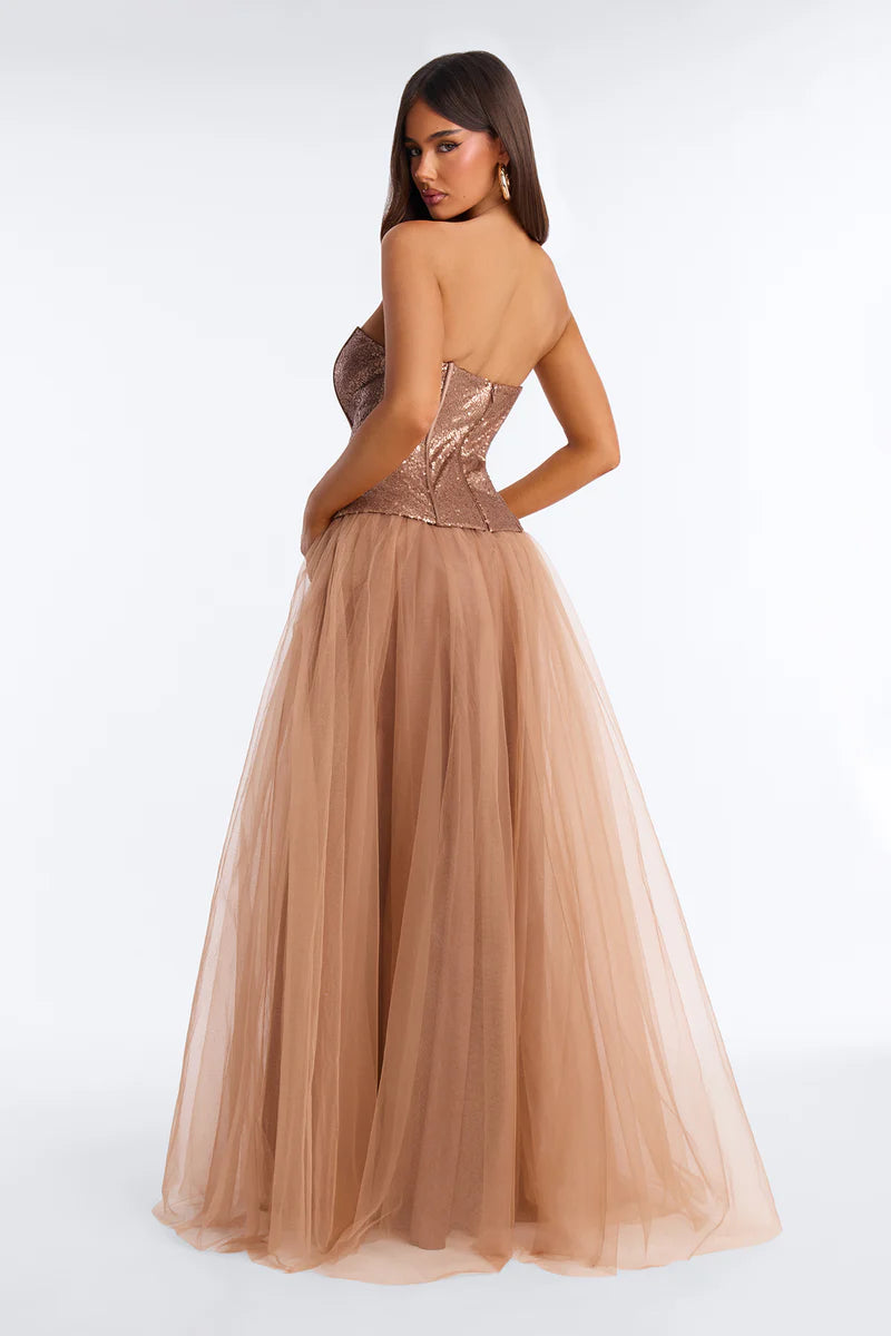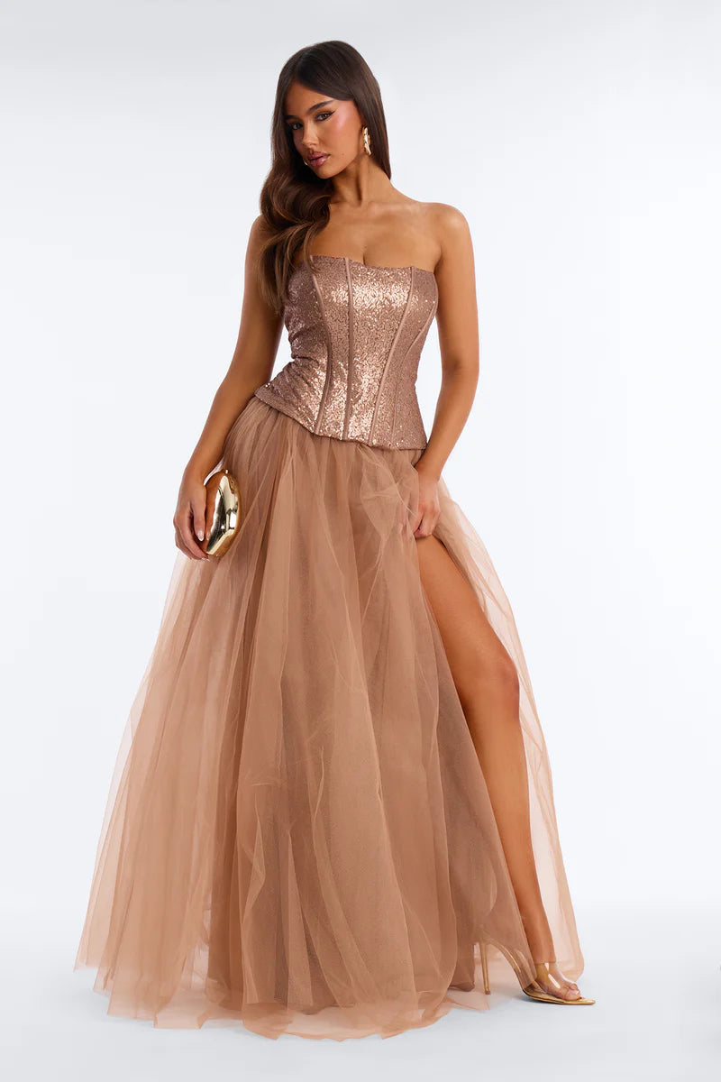 Romantic ALine Strapless Neck Tulle FloorLength Slit Corset Prom Dress